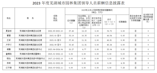 2023年度蕪湖城市園林集團領(lǐng)導人員薪酬信息披露表